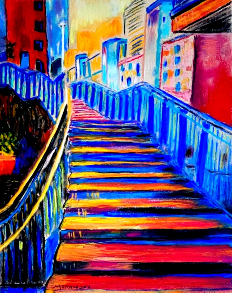 Higher Ground, Stairway near the San Antonio Riverwalk. When I walk along the Riverwalk, one scene I always notice is a beautiful stairway from the river to the street above. I tried to capture it in my artwork using vibrant colors to match the vibrancy and beauty of our city. We have a city that's both diverse and welcoming. Tourists visit from around the world. San Antonio is a fun and worthwhile destination!